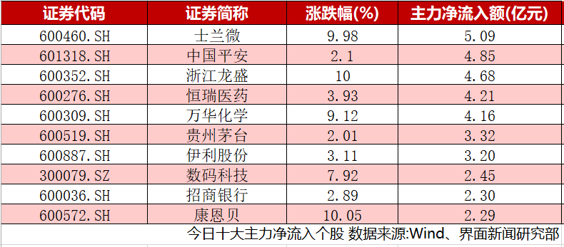 剔除尚未开板的新股,全天沪深两市主力净流入额超过1亿元的个股数量为36只。士兰微(600460.SH)、中国平安(601318.SH)、浙江龙盛(600352.SH)主力净流入额位居前三分别录得5.09亿元、4.85亿元、4.68亿元。浙江龙盛(600352.SH)、康恩贝(600572.SH)双双涨停。士兰微(600460.SH)、万华化学(600309.SH)涨幅均逾9%。