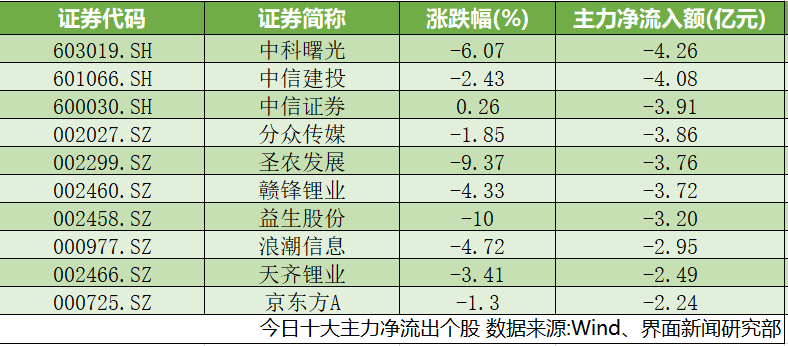 沪深两市共计56只个股主力净流出额超1亿元。中科曙光(603019.SH)、中信建投(601066.SH)、中信证券(600030.SH)主力净流出额位居前三,分别为4.26亿元、4.08亿元、3.91亿元。益生股份(002458.SZ)跌停,圣农发展(002299.SZ)跌幅逾9%。