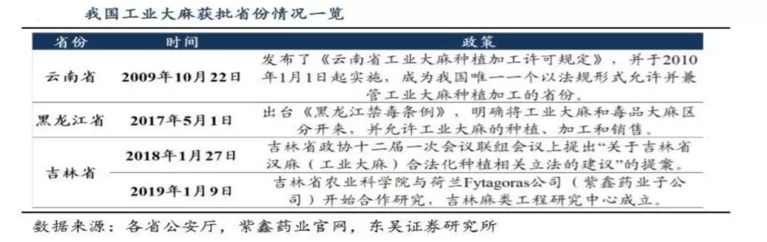 据天风证券统计,截至2019年1月,全球有41个国家(美国、加拿大、澳大利亚等)宣布医疗用大麻合法,超过50个国家宣布CBD(大麻二酚)合法。目前,我国云南、黑龙江已对工业大麻种植和销售合法化。
