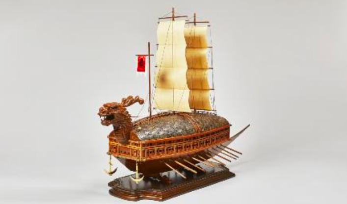 这艘“龟船”长130厘米、高110厘米、宽60厘米,有10对橹和枪炮等“火器”,船头有龙头,桅杆上悬挂写着“龜”字的旗帜和折叠式风帆。