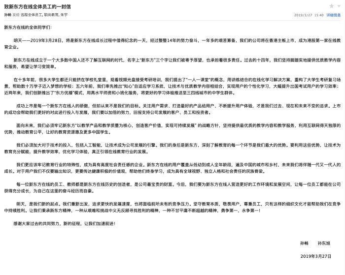 被称为“在线版新东方”的新东方在线即将于3月28日在港交所上市。今日,新东方在线联席CEO孙畅与联席CEO孙东旭联名发布内部信,回顾了新东方在线的成长历程并对上市后的未来进行了展望。