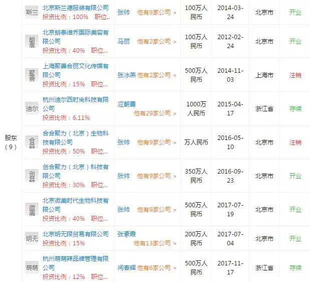 事实上,张帅的生意经不比黄晓明、范冰冰差多少,旗下9家公司↓