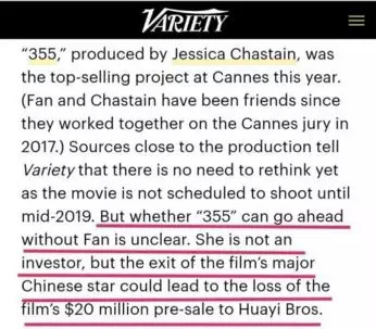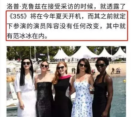 另一边,原定范冰冰参演的好莱坞大片《355》,范冰冰出事后频频传出可能会被除名的消息。