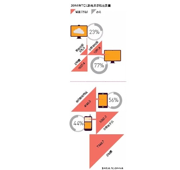 2013年起,TCL海外业务终于进入收获期,TCL通讯是其中最大亮点。2014年TCL手机卖出了7340万台,近90%来自于海外市场,销售收入245.2亿元,同比增长60%,净利润达8.64亿元,同比增加2.41倍。2014年第四季度,TCL手机出货量全球排名第四,智能手机销量在全球位列第七位。2015年1月,TCL通讯收购的老牌智能手机Palm品牌,是TCL、阿尔卡特之后第三个手机品牌。李东生透露,2015年TCL将把印度、巴西为代表的新兴市场作为突破重点,彩电、手机和家电联动,同时会将目前的多品牌战略逐步向TCL统一品牌收缩。