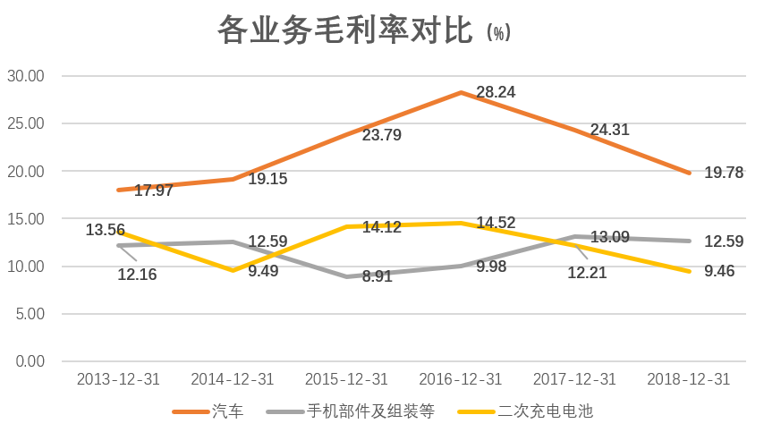 汽车业务的毛利率数据显示,2018年的汽车业务的毛利率,从2017年的24.3%,下滑至19.78%。这其中有一部分是由于新会计准则的变化,将一部分销售费用归为了营业成本。