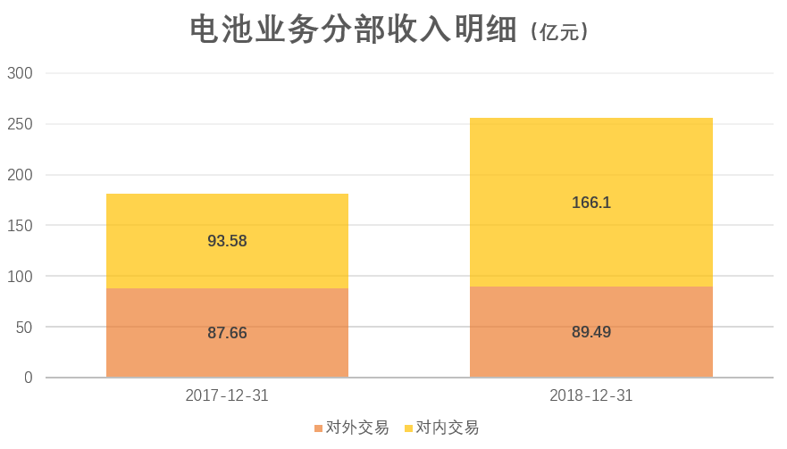 财务数据显示,2018年比亚迪电池合计销售金额达到255.56亿元,较2017年的181亿元,提高41%。其中,对内销售为166.1亿元,对外销售额为89.5亿元,两个数据都较2017年分别提高77%以及2%。但由于对内销售最终会体现在整车的销售中,因此对内销售的数据在集团合并层面被抵消,最终体现在收入上的是电池业务增速仅提高了2%。