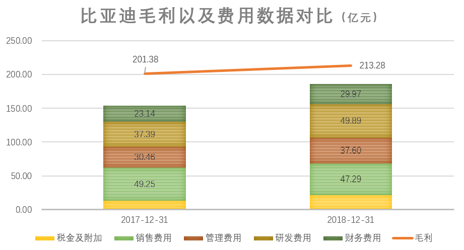 费用的增长是侵蚀利润的主要原因。销售、管理、财务以及研发四大费用中,研发费用首次超过其他三大费用。2018年,比亚迪的研发费用达到49.89亿元,较2017年上涨超过33%。