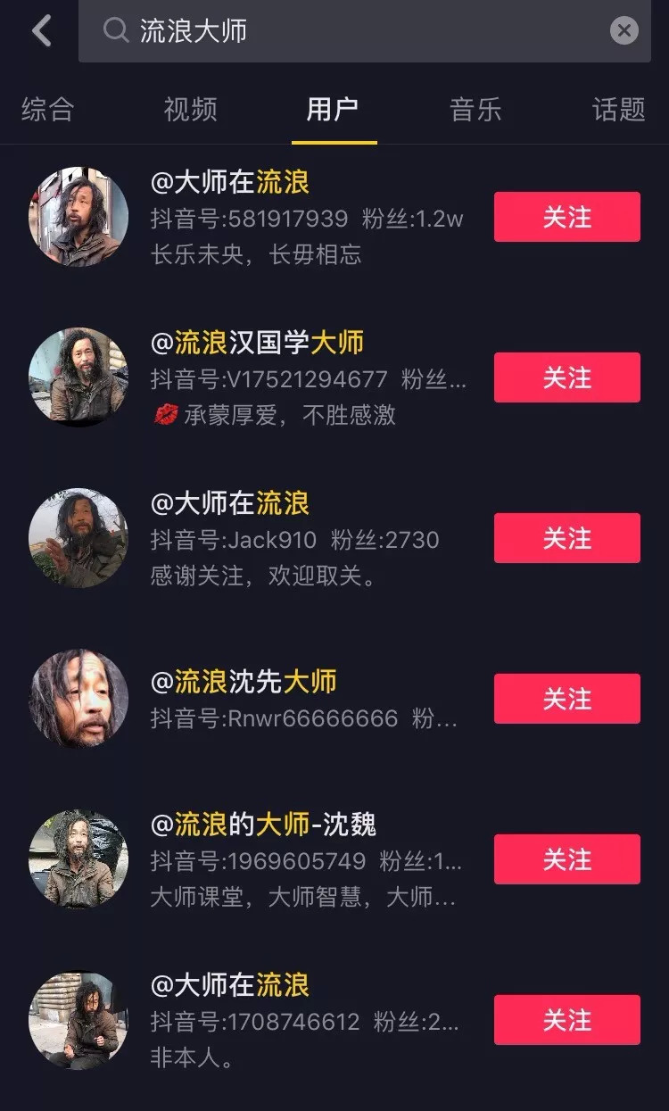 而用户名带上了“大师”、“流浪”字眼的账户有上百个,粉丝数最多的甚至有118w。