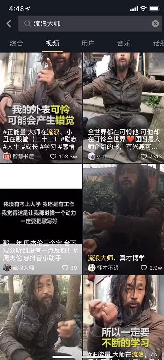 搜索“流浪大师”跳出的数百个视频,有的点赞高达100w+。