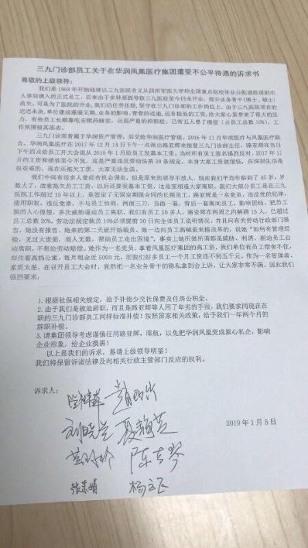 2019年1月5日,华润三九医药股份有限公司下属三九门诊部的数位老员工联合撰写《关于三九门诊部被迫离职45岁以上老员工请求上级领导给予劳动补偿的诉求书》和《三九门诊部员工关于在华润凤凰医疗集团遭受不公平待遇的诉求书》,讲述了自身的遭遇。