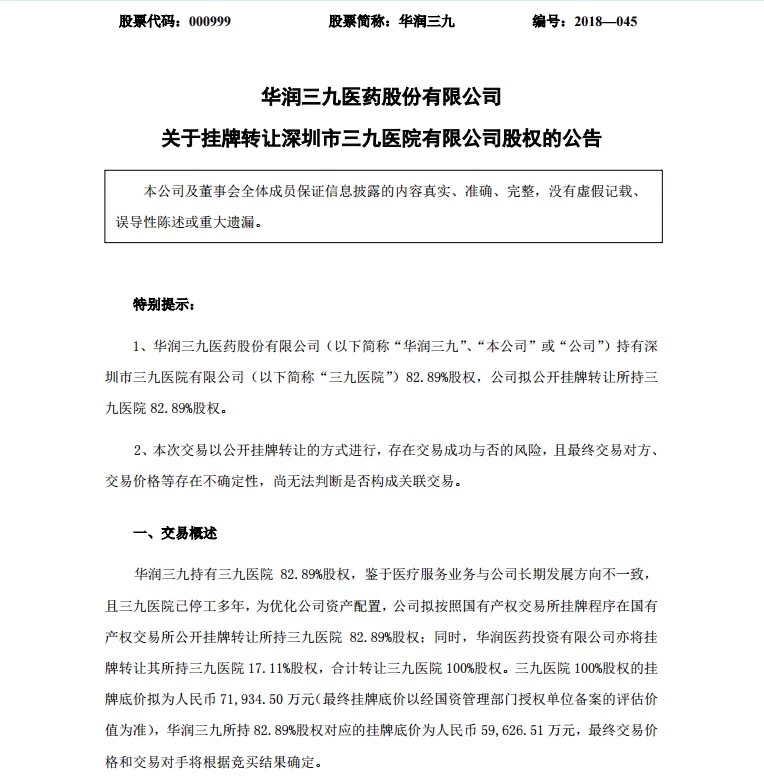 但华润依旧没能让三九医院落地,三九医院又一次面临着易主的局面。华润三九于2018年10月9日发布公告,拟公开挂牌转让所持三九医院82.89%股权。