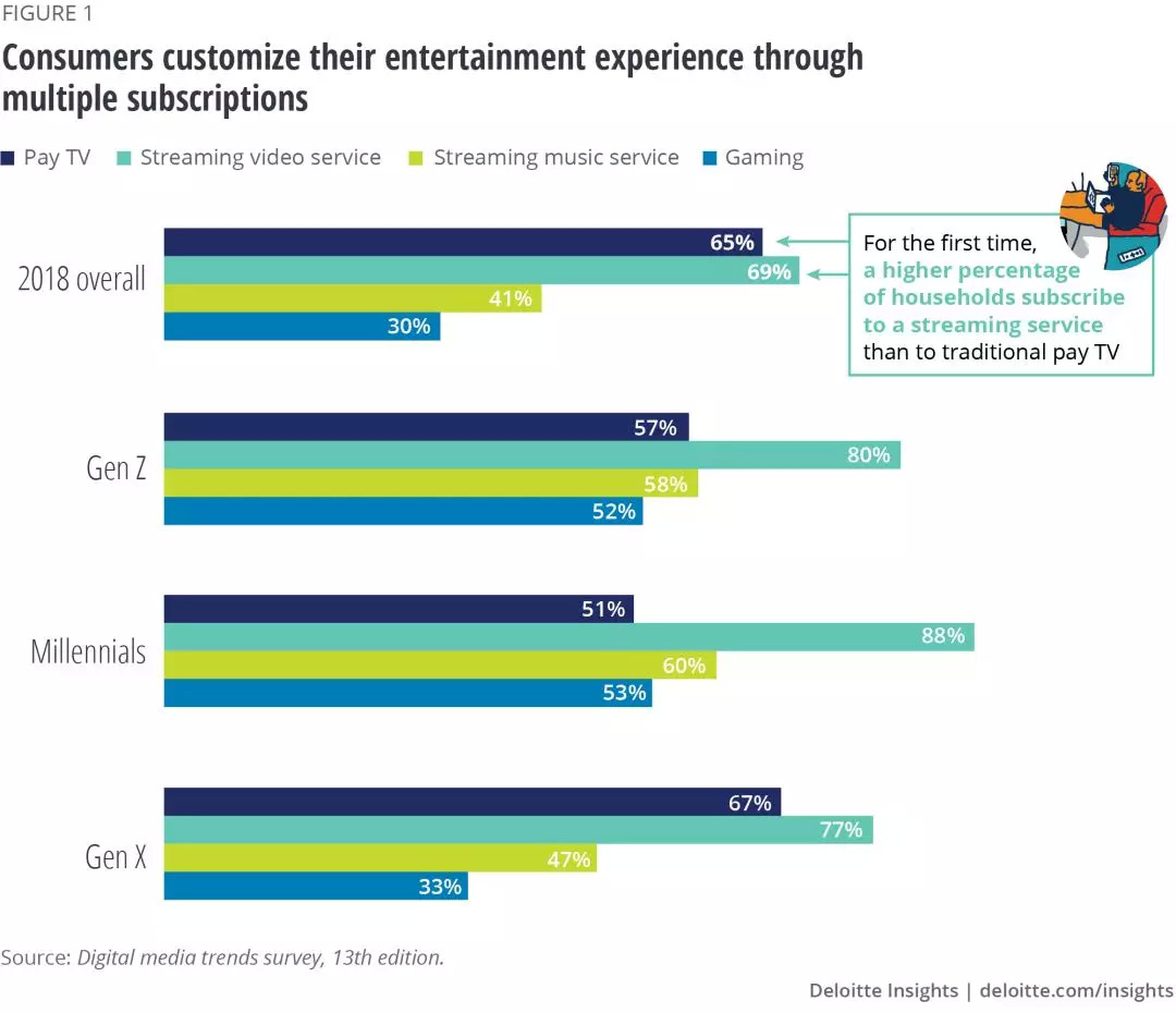 基于互联网的视频和音乐流媒体和游戏平台是相对较新的选项,消费者可以根据自己的兴趣和预算进行选择和安排。其中一部分选择很快就成为了用户媒体体验的新基石——用户很难想象没有它们的生活。传统的付费电视频道已经在流媒体的对比下黯然失色,但对于接受调查的65%的消费者而言,它仍然是用户娱乐体验的关键部分。