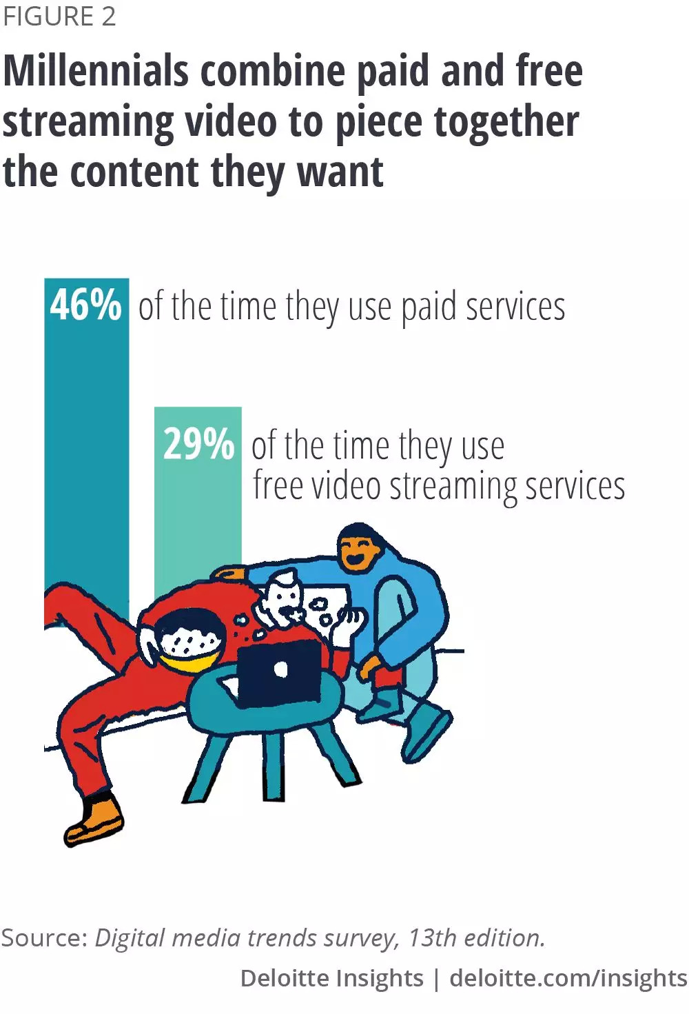 其次,顾客愿意为了免广告而支付订阅费。44%的受访者提到,“无广告”是订阅新的流媒体服务的首选条件。千禧一代的在线视频用户将近一半的时间花在了观看付费节目上,大约三分之一的时间花在了浏览免费、带广告的视频平台,比如YouTube 或 Sony Crackle,剩下的时间则平分给付费电视节目、电视直播和点播节目。