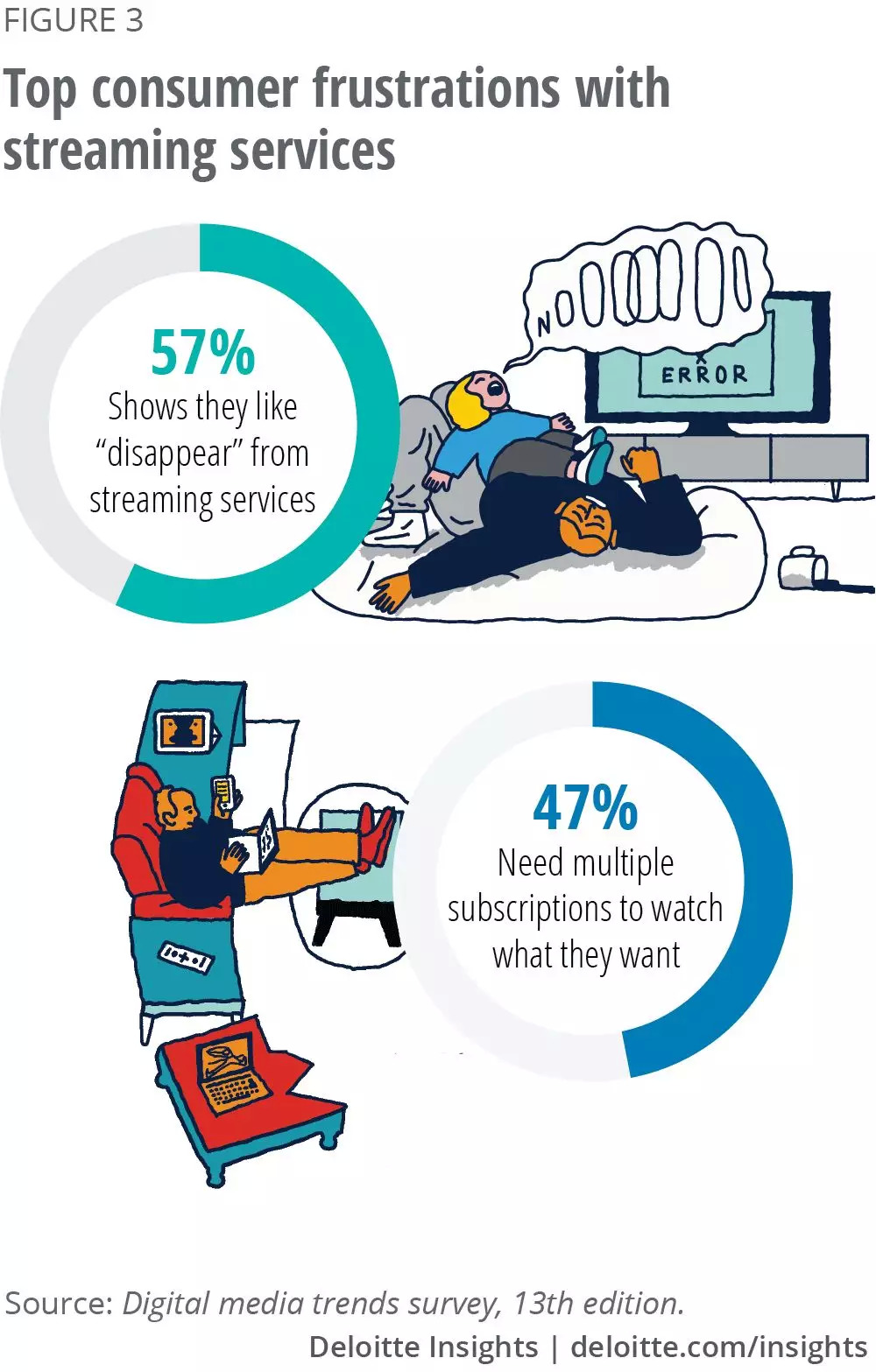 很多人会选择多重服务而非“放弃自己喜爱的节目”。但47%的消费者因纷繁复杂的订阅而感到负担。48%的受访者则说,多渠道分发让他们更难找到喜欢的作品。43%的用户还表示,如果几分钟之内找不到喜欢的东西,他们就会放弃寻找——尽管选择众多,消费者依然感到“好片难寻”。