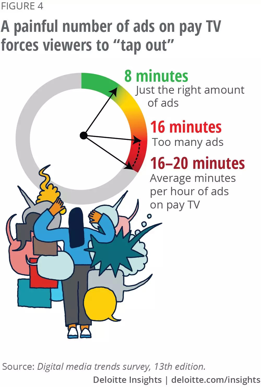 举例来说,75%的消费者认为,付费电视频道的广告太多了。每小时8分钟的广告最合适,一旦超过16分钟,他们就会换台。然而,付费电视普遍的广告时长是每小时16-20分钟。很多消费者表示无法接受,因而退订。
