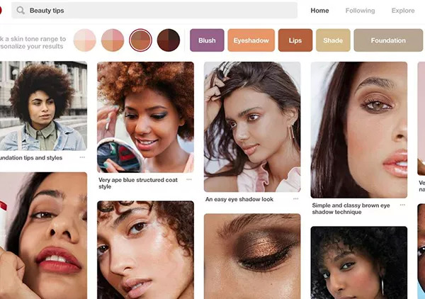 在Pinterest上面最受欢迎的类别之一就是化妆品,而Pinterest也通过不断改进,让用户可以选择肤色范围和头发颜色,生成相关品牌产品推荐的方式。数亿张图片经过过滤,到达用户首页的相关妆容和品牌产品都根据该用户个性推荐。