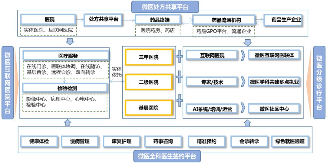 产业生态方面,互联网医疗以城市医联体、医共体、跨区域专科联盟、远程医疗协作网的形式推动地区医联体建设,并促进区域医疗资源以患者精准匹配输送、医患实时交流与信息互通、大型医院技术能力的下沉,实现区域医疗机构品牌共享、患者资源与医生资源的共享。