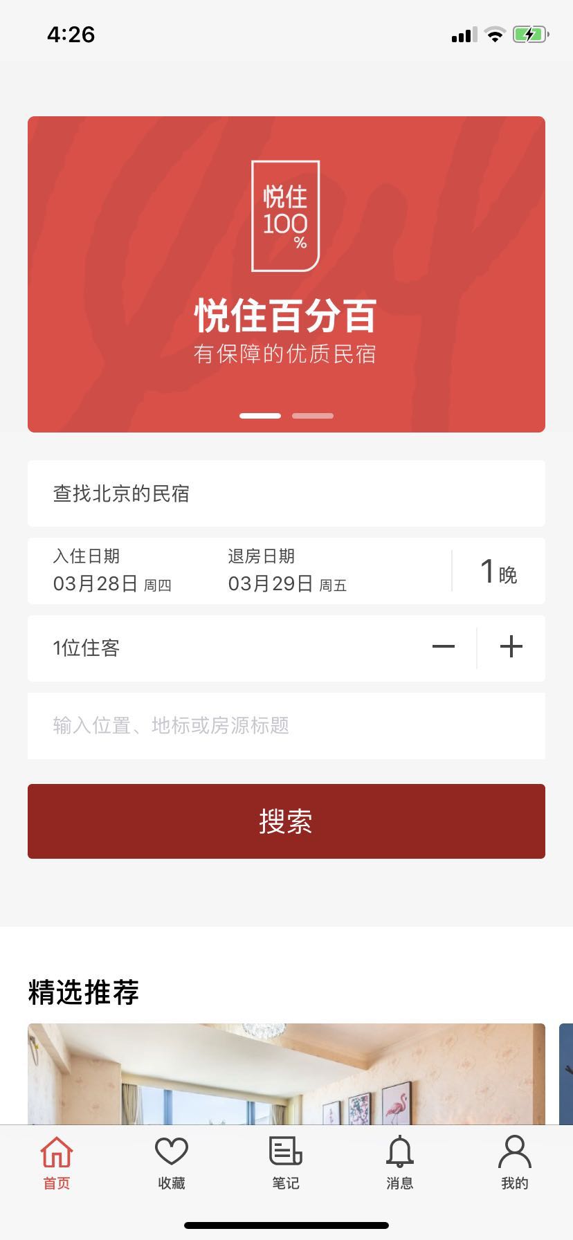 从App上来看,悦宿的页面简洁,功能直接,包含按预订需求搜索房源、精选推荐、热门目的地房源推荐、热门笔记(相当于民宿体验攻略)几部分。在单个民宿信息呈现上,与Airbnb等其他民宿平台大同小异。