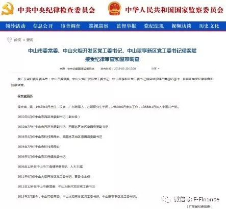 另花朵财经注意到,南粤清风网3月20日消息,广东省中山市委常委、中山火炬开发区党工委书记、中山翠亨新区党工委书记侯奕斌涉嫌严重违纪违法,目前正接受纪律审查和监察调查。