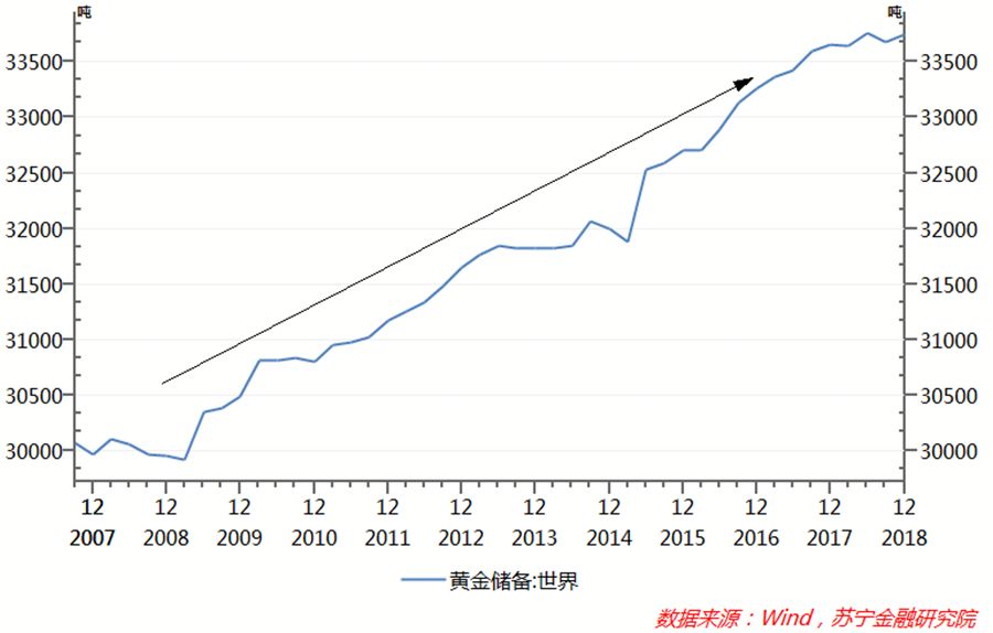 截至2018年末,全球央行持有的黄金储备规模达到33742吨,十年内的增加额超过了3800吨(参见下图)。