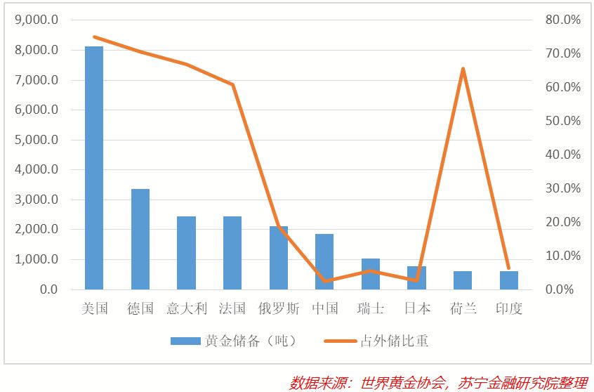 在全球十大黄金储备国中,美国和欧元区国家由于具有储备货币发行国的优势,黄金储备规模远在中国和日本之上。