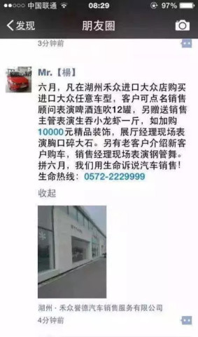 嗯,虽说现在汽车市场不景气,但是这两天看到了如此这般能文能武的汽车销售,咱立刻感到士气大振啊。谁说我大汽车圈就是有钱一团和气、没钱抢着撕逼?谁说咱不能同舟共济?有这样的销售在,我汽车业翌日必能一扫颓势、重整雄风!