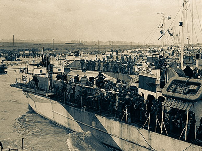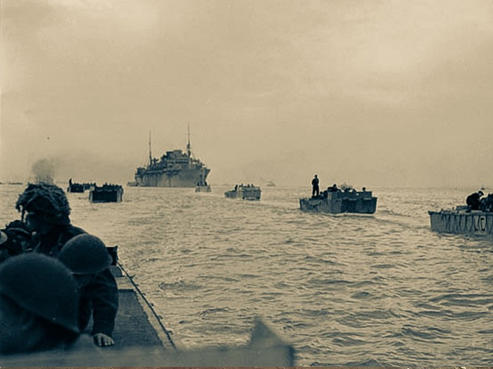 在伞兵运输机从空中进入的同时,同盟军的船只陆续登陆海滩。