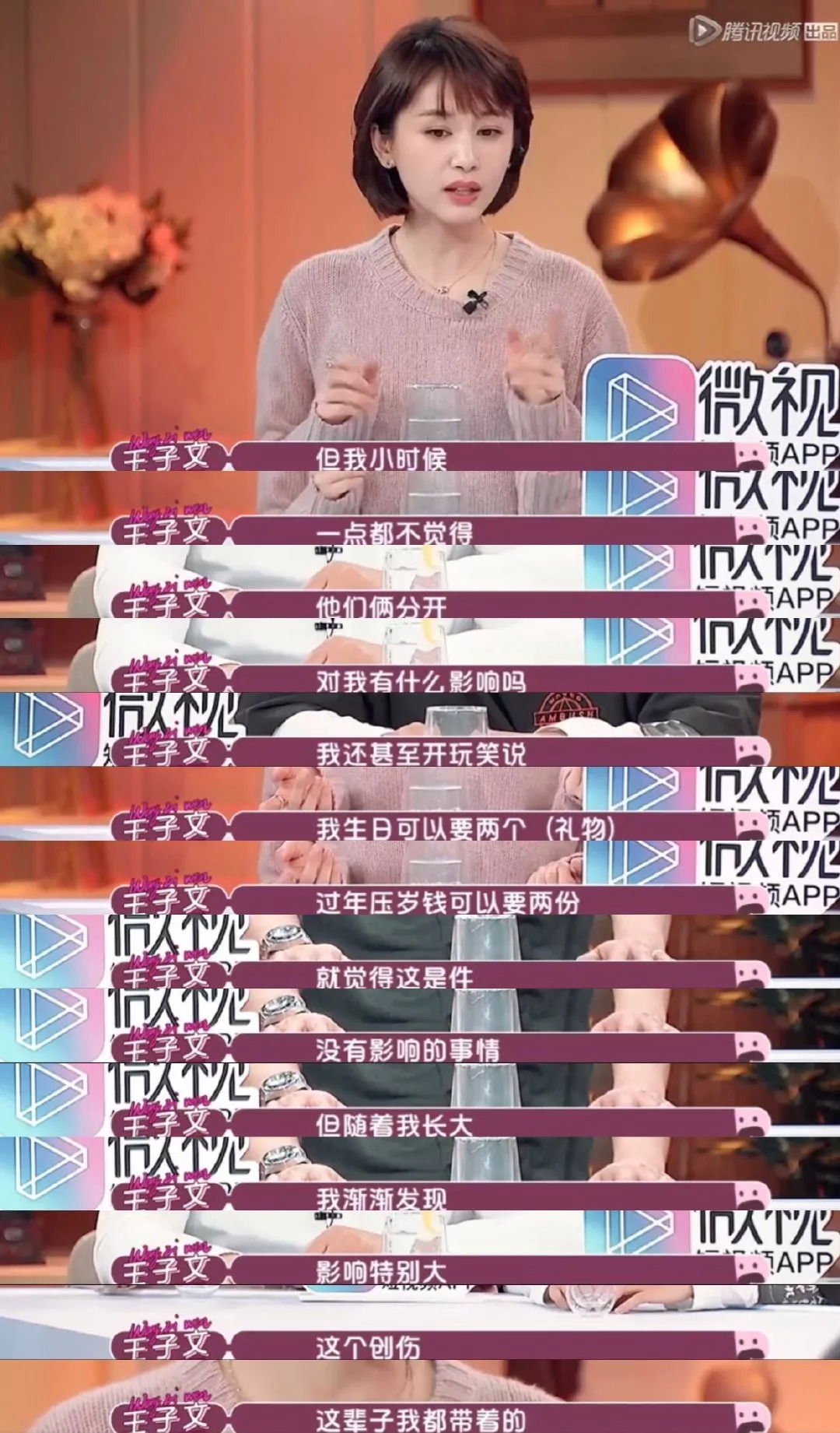 在《吐槽大会》第三季当中,张韶涵对于原生家庭的惨痛伤害,直言“别人觉得我是天生励志,我是天生丽质。”7岁时父母离异、曾称自己为“别人家长大的小孩”陈学冬在《我家那小子》和《奇遇人生》这两档真人秀节目当中,都有提及自己的家庭问题;在《奇遇人生》当中毛不易回忆母亲去世前的过往,“遗憾直到母亲过世,他都不算是个成功的人,一直在挂科可能拿不到毕业证,又不会照顾自己。”这一番言语让不少网友爆哭,表示“心疼毛毛。”
