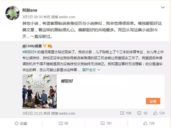 心理学家弗里曼认为,原生家庭的不足,将成为一个人后续人生的索求和追逐,而这也成为了推动个人成长的关键所在。在《都挺好》中幼时被偏待、只能上公费大学的苏明玉,在成年之后努力赚钱成为三兄妹中最有出息的女儿。对于镜头里展现苏明玉所遭受的原生家庭的伤害,让不少有着类似经历的网友咬牙切齿,也让《都挺好》作者心疼不已。