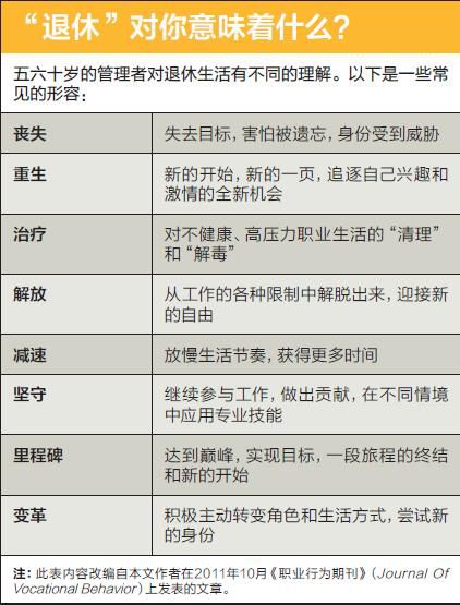 在与管理者合作的过程中,我们开始对当下人们的退休方式感兴趣。为了解各类人的不同选择,我们与约克大学的耶莱娜·基奇克(Jelena Zikic)合作,对100名新近退休或积极计划退休的企业管理者(包括高管)进行深入访谈。为更全面了解当下职场人士的退休状况,我们还采访了相关行业(包括金融服务、资源和高科技制造)24家企业的人力资源专家。我们选择研究管理者,是因为他们的离开会给组织带来重要影响,还因为他们经济状况相对较好,能更自由地选择退休的时间和方式。