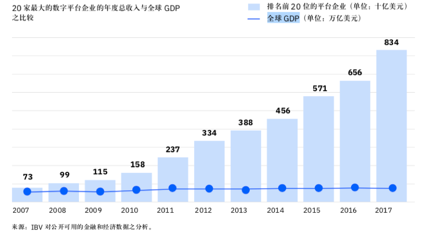 如果把全球前20大数字平台公司,各自十年来的年度收入拿出来画成曲线图,你会发现,它们呈现出令人惊叹的指数型增长趋势。全球GDP十年来的增长率,在它面前显得平淡无奇。