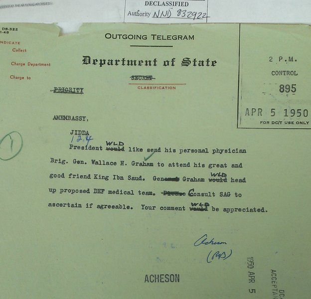美国国家档案馆收录的解密文件显示,美国国务卿艾奇逊(Dean Acheson)当时在给美国驻吉达大使馆的一封电报中写到,杜鲁门总统希望格雷厄姆准将带领的医疗团队能“照顾好他这位伟大的好朋友”。