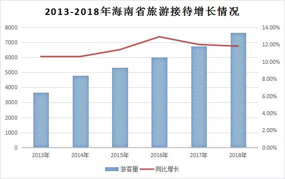 2018年,海南省接待国内外游客总人数7627.4万人次、增长11.8%,高于预期1.8个百分点;实现旅游总收入950.2亿元、增长14.5%,高于预期2.5个百分点。新旅界统计了2013-2018年数据发现,海南省历年接待游客总人数保持稳定增长,年增长率基本维持在11%左右。