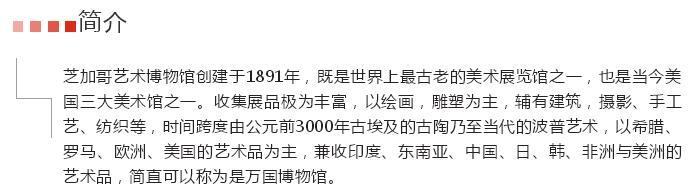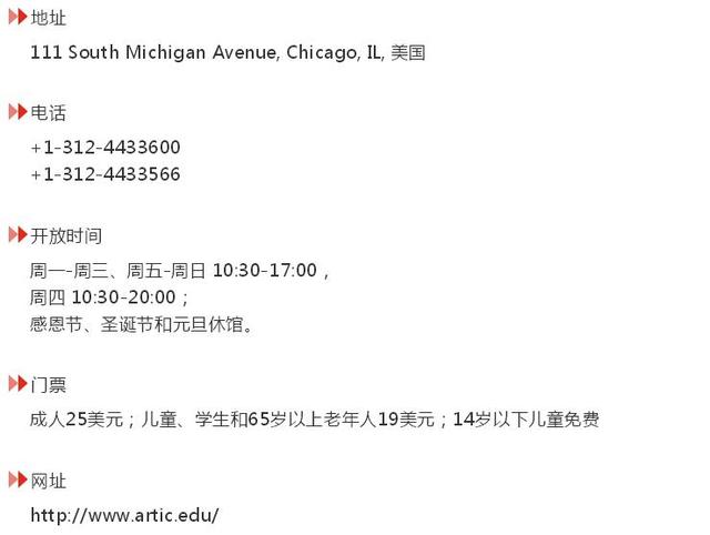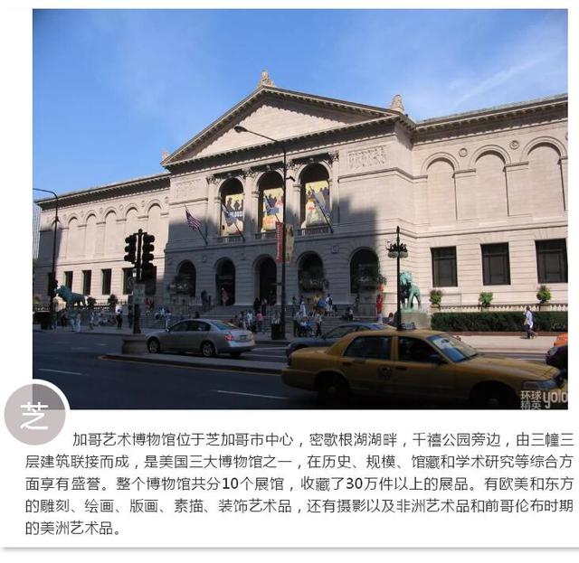 博物馆正门入口处面临密歇根南大街,外观呈维多利亚风格。馆内收藏了上下五千年、纵横五大洲的艺术珍品,简直可以称为是万国博物馆。尤其是法国印象派画家的代表作享誉世界,藏品中有雷诺阿、毕加索、梵高等一代宗师的巨作,可以说是价值连城,就连盘踞于大门两侧的青铜狮子塑像也成了芝加哥城的标志。