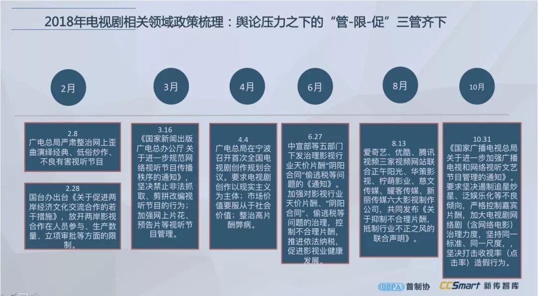 据不完全统计,2018年剧集方面的政策调控涵盖了低俗内容、天价片酬、阴阳合同、偷税漏税、收视造假等多方面,管理、限制和促进三管齐下,致力于促进行业健康发展。