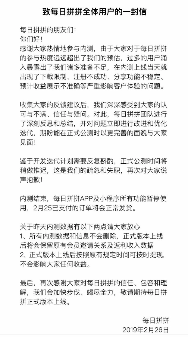 除此以外,上线首日每日拼拼还出现了下载限制、注册不成功、分享功能不稳定、预计收益展示不准确等严重影响客户体验的问题。导致上线当天就宣布下线整改。