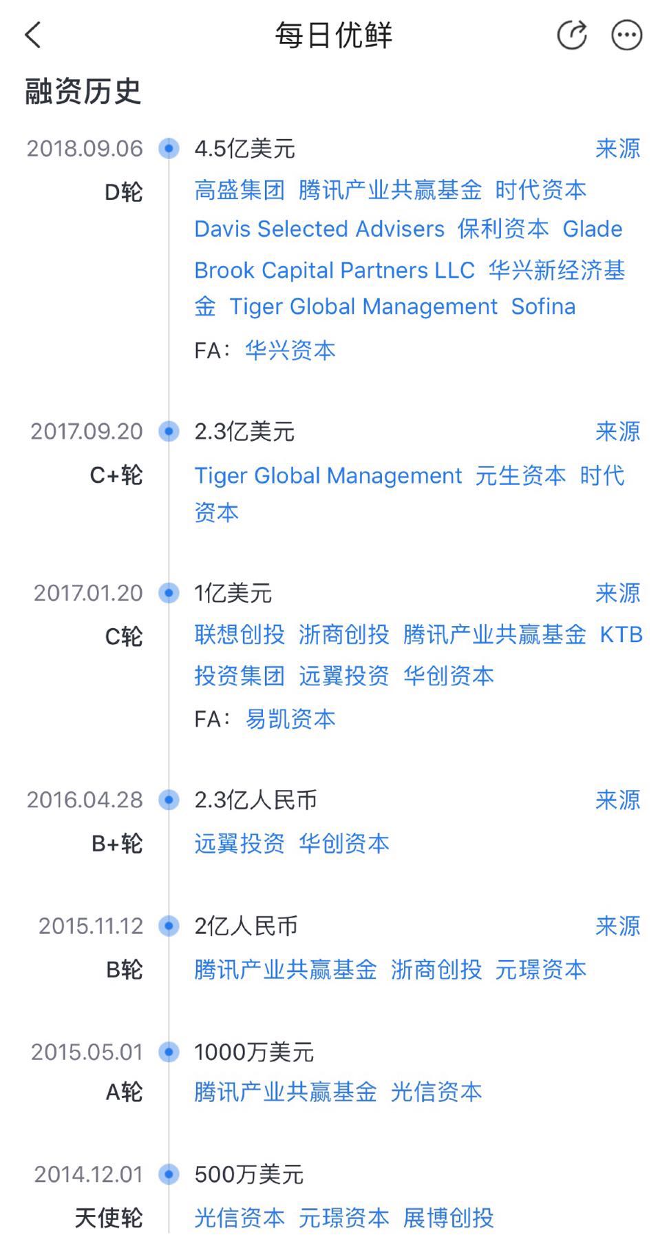 成立5年来,每日优鲜已经陆续完成了7轮融资。最近一轮融资是去年9月完成的,总金额达4.5亿美元,领投方包括高盛、腾讯、时代资本等。可以说,每日优鲜在融资能力上绝对处于赛道前列。