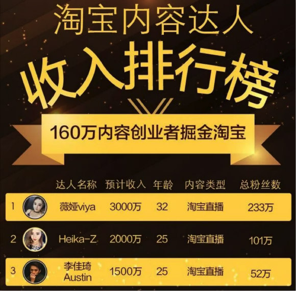 在淘宝上半年发布的达人收入排行榜(“淘布斯”)上,李佳琦紧随薇娅、Heika-Z,以1500万元排名第三,也是淘布斯唯一上榜的男性达人。