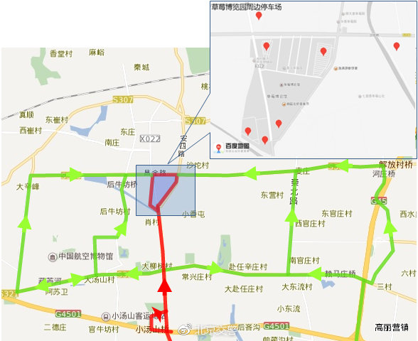 2. 3月16日至5月12日,昌平草莓博览园将举办农业嘉年华。从往年情况看,周末自驾前往的市民较多,周边安四路、立汤路、四场路、北六环小汤山桥区等车流量大,园区周边停车位略显不足。建议市民朋友去往农业嘉年华前,提前规划好行车路线,可视实时路况绕行顺沙路、昌金路、秦上路、秦北路等,并选择好停车场停放车辆。