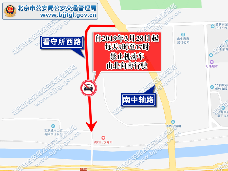 自2019年3月28日起,每天9时至17时,看守所西路(南红门水务所北侧路至南中轴路之间路段)将禁止机动车由北向南行驶。