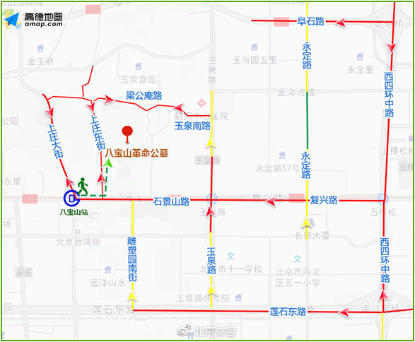 从往年情况,八宝山周边石景山路八宝山路口至玉泉路路口东向西方向交通压力突出,革命公墓南门东向西、人民公墓西门南北双向等容易出现车多行驶缓慢的情况。交管部门将协调开辟周边多处停车场,前往祭扫的市民朋友可选择由阜石路、鲁谷路、莲石路绕行上庄大街。