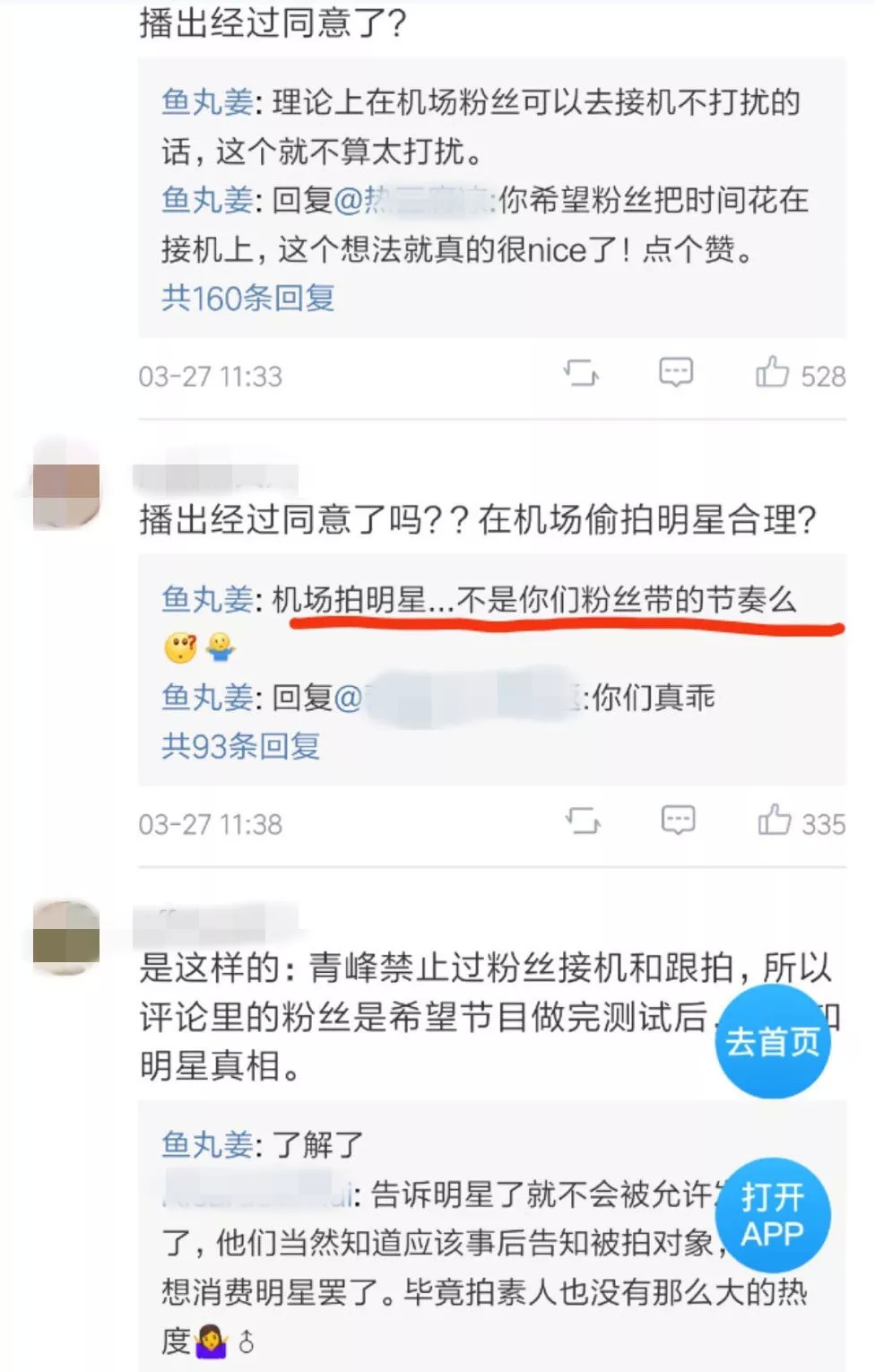 对此,鱼丸姜曾在微博回复道“理论上在机场粉丝可以去接机不打扰的话,这个就不算太打扰”“机场拍明星,不是你们粉丝带的节奏吗”,还称“在我看来只有公共场合和非公共场合”,暗示其在公共场合的拍摄不属于违法。