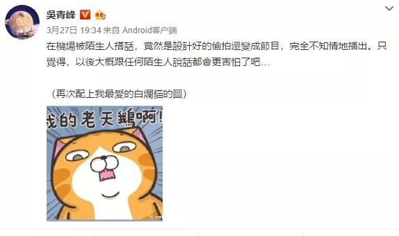 “在机场被陌生人搭话,竟然是设计好的偷拍还变成节目,完全不知情地播出。只觉得,以后大概跟任何陌生人说话都会更害怕了吧……”。3月27日,吴青峰在微博中有些愤怒地写到。