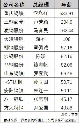 据界面新闻记者不完全统计,在已披露薪酬的上市钢企中,李永祥的年薪可位列各大钢企总经理第一,是第二名三钢闽光(002110.SZ)总经理卢芳颖234万元的两倍多。