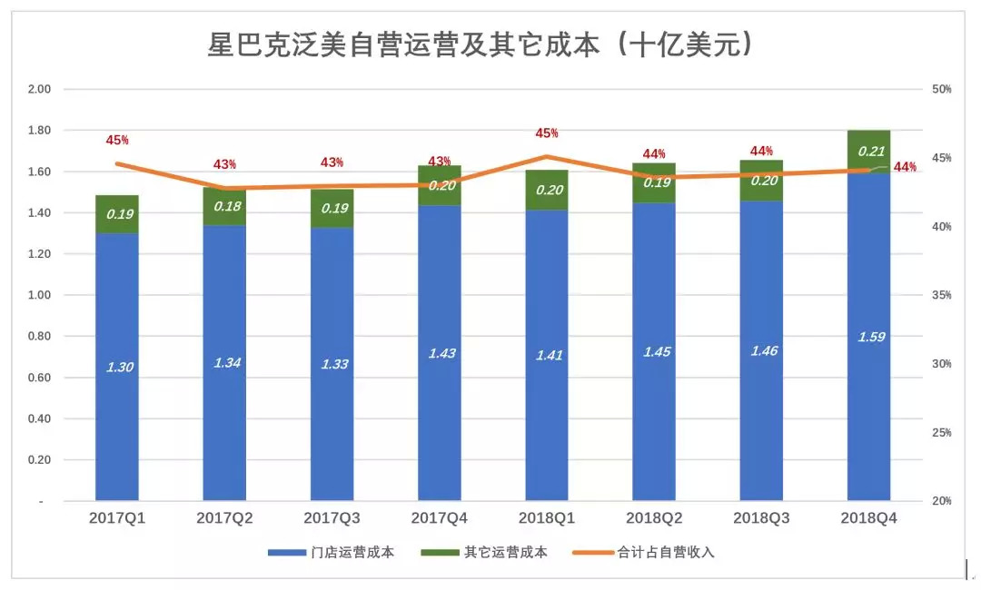 泛美区门店运营成本、其它成本(包括仓储物流、折旧及摊销)占自营门店收入的比例也优于星巴克整体水平。2018年Q4,泛美区自营门店运营成本为15.9亿美元,折旧及其它运营成本合计2.1亿美元。上述各项成本合计18亿美元,占泛美区自营收入的44%,较星巴克整体水平低2个百分点。