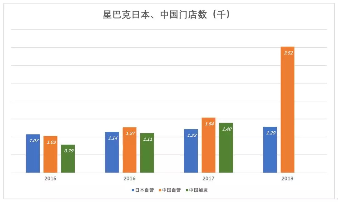 前面分析过,星巴克业绩是自营、加盟“双轮驱动”的。理想的局面是自营、加盟门店数“六四开”,既能低成本扩张又能效控制风险,还能够使公司整体利益最大化。在中国、日本采取的自营不是星巴克的理想模式。
