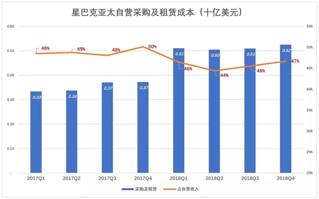 星巴克最重要的支出是原辅料、包装材料采构及自营门店租赁,财报将这几项支付归纳为cost of sales including occupancy costs。2018财年,此项成本首次超过100亿美元,占自营收入的51.7%。
