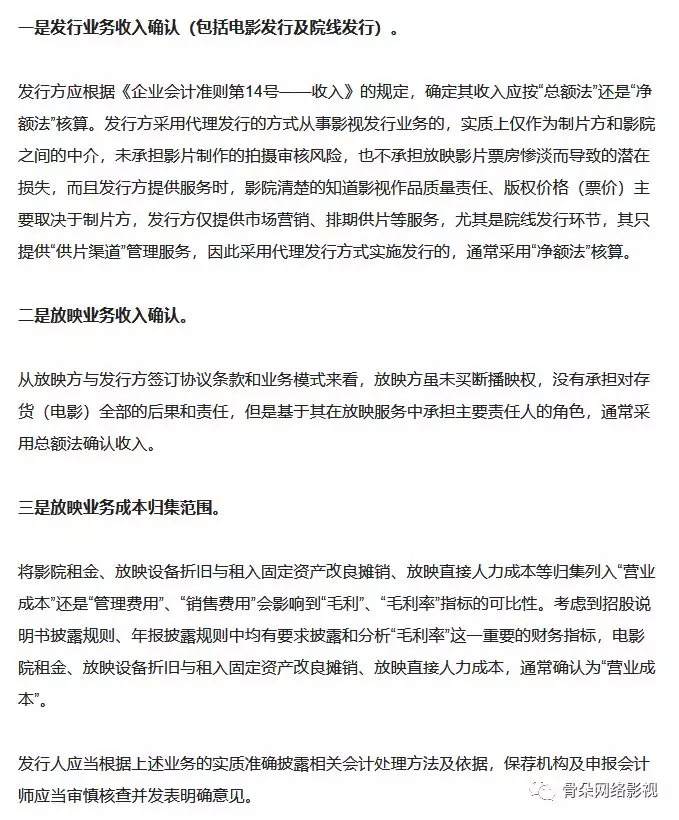跟影视行业有关的首先是问答中的第32问,提到了影视产业收入分配方式,即发行业务收入确认(包括电影发行及院线发行)、放映业务收入确认、放映业务成本归集范围。