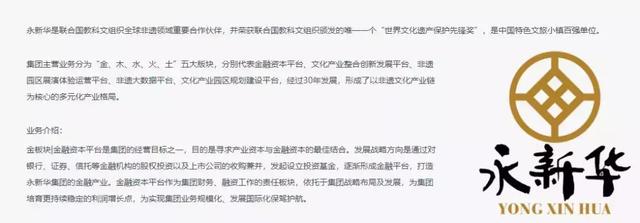 据其官网介绍,永新华的主营业务是以非遗传承保护及创新创意发展为核心,涵盖产业创新、大数据库、园区建设开发、园区运营管理、金融资本管理等各个方面。