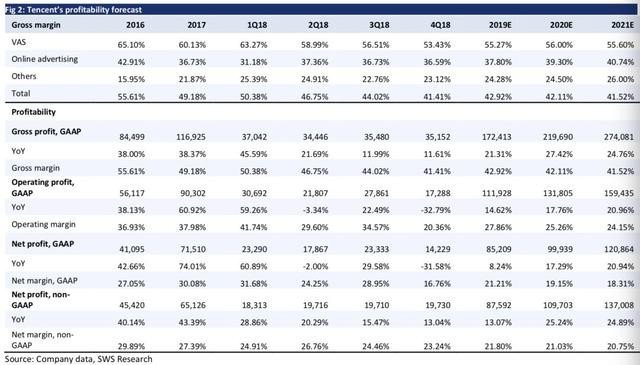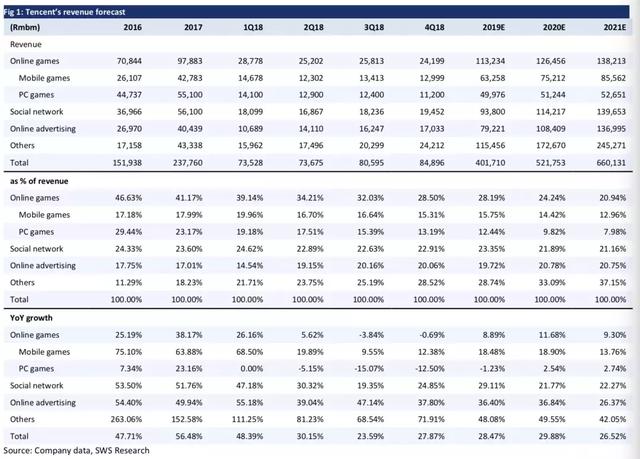 在国内知名券商申万宏源在3月底的一份研报中,对腾讯各个收入板块未来所做贡献做出来预测,认为2019年游戏业务收入在总收入会延续2018年Q4的局面,进一步降至37%左右,而到了2021年会低于20%。
